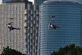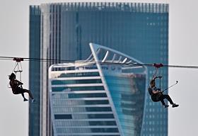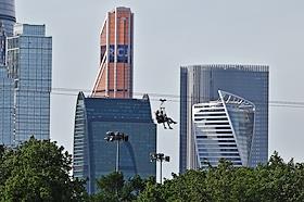 Жанровая фотография. Молодые люди в экстрим-парке Skypark Moscow на Воробьёвых горах во время спуска…