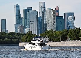 Жанровая фотография. Арендный катер для речных прогулок на Москве-реке на фоне башен Московского…