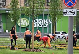 Жанровая фотография. Сотрудники городской коммунальной службы во время высадки цветов.