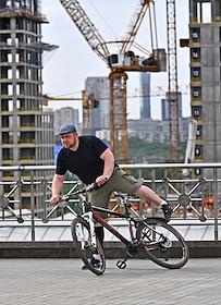 Жанровая фотография. Мужчина на велосипеде на фоне строительства.