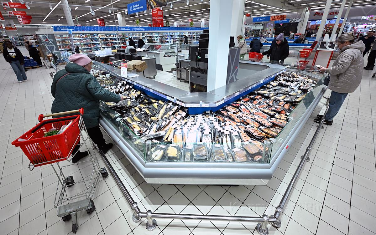 Работа гипермаркета "АШАН" в ТЦ "Гагаринский" на улице Вавилова. Покупатели в отделе гастрономии…