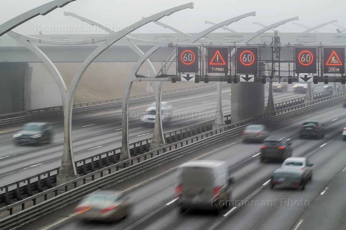 Жанровые фотографии. Туман над Западным скоростным диаметром (ЗСД). Автомобили во время движения по…