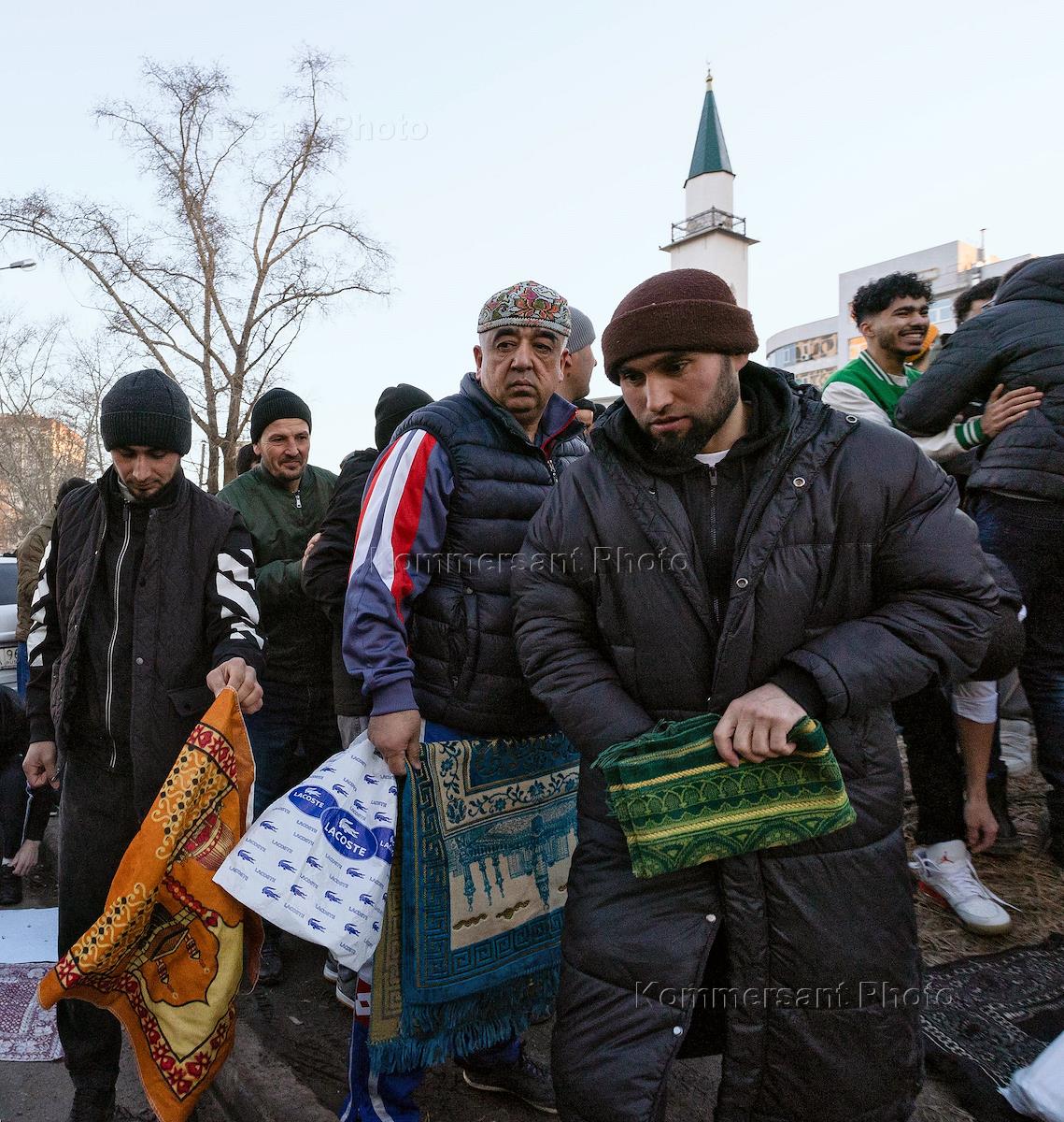 Праздничные мероприятия в день Ураза Байрам у мечети Абу-Ханифа. Верующие во время богослужения.