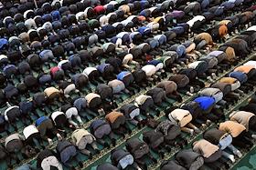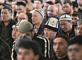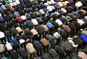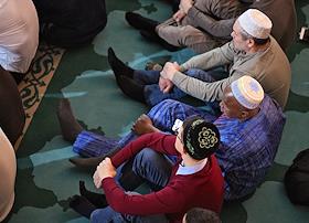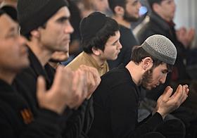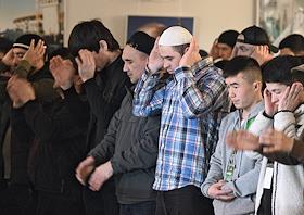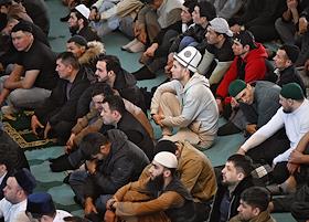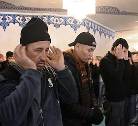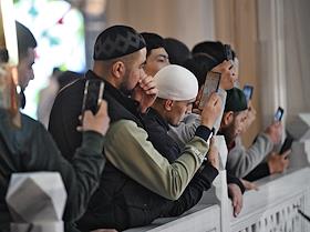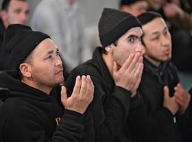 Праздничные мероприятия в день Ураза Байрам в Московской Соборной мечети. Верующие во время…