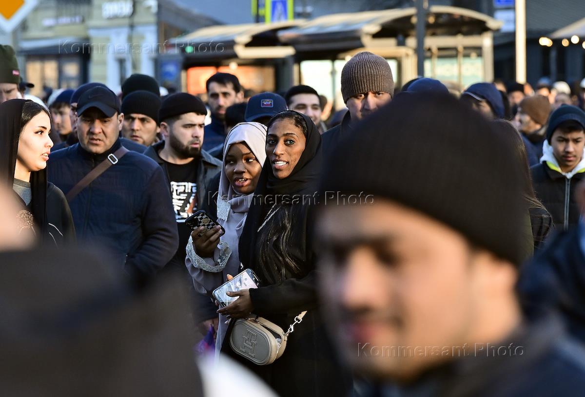 Праздничные мероприятия в день Ураза Байрам в Санкт-Петербургской соборной мечети. Верующие перед…