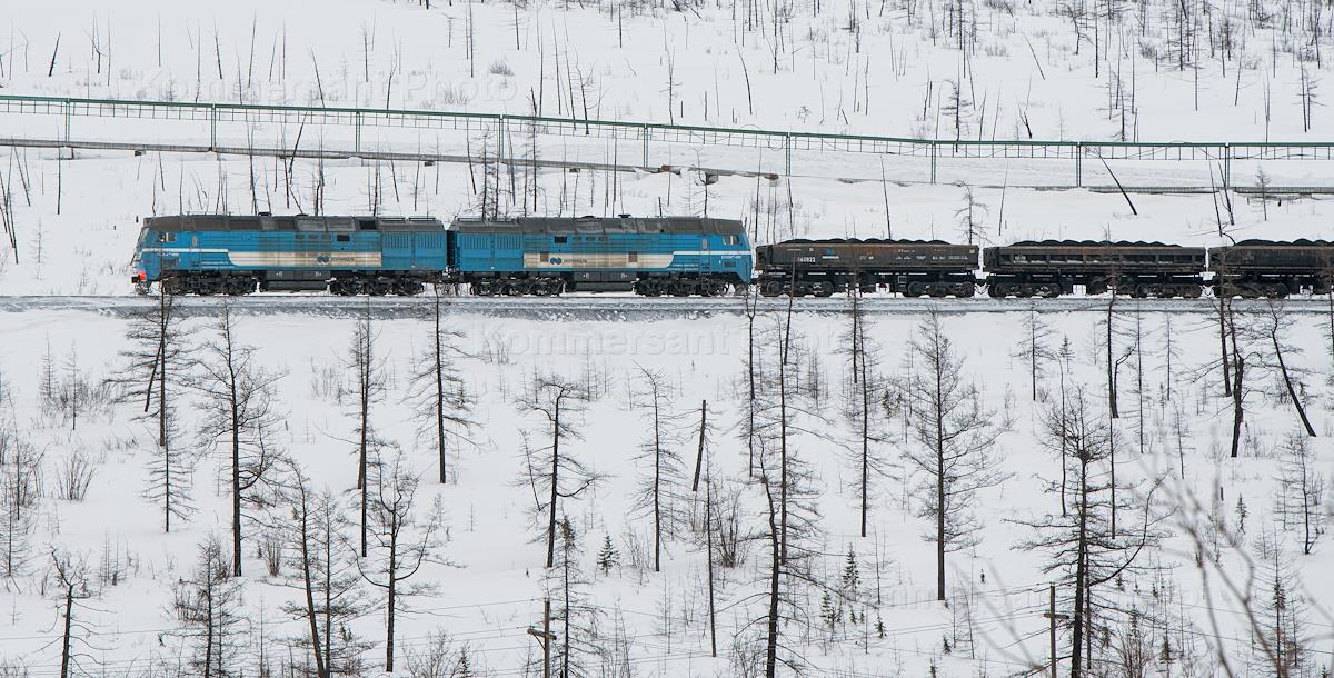 Жанровая фотография. Грузовой железнодорожный состав с углем в тундре на подъезде к Норильску.