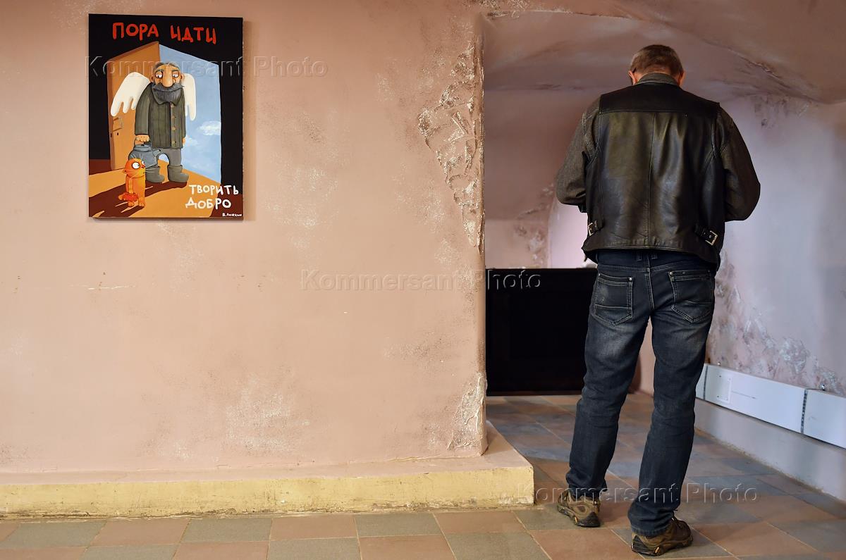 Церемония открытия "Музея бомжей" на Гороховой улице, дом 31. Жанровая фотография. Посетитель на…