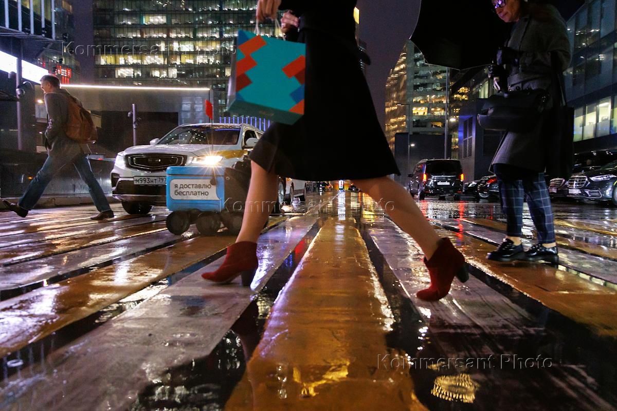 Жанровая фотография. Роботы-доставщики компании "Яндекс Еда" на пешеходном переходе и автомобиль…