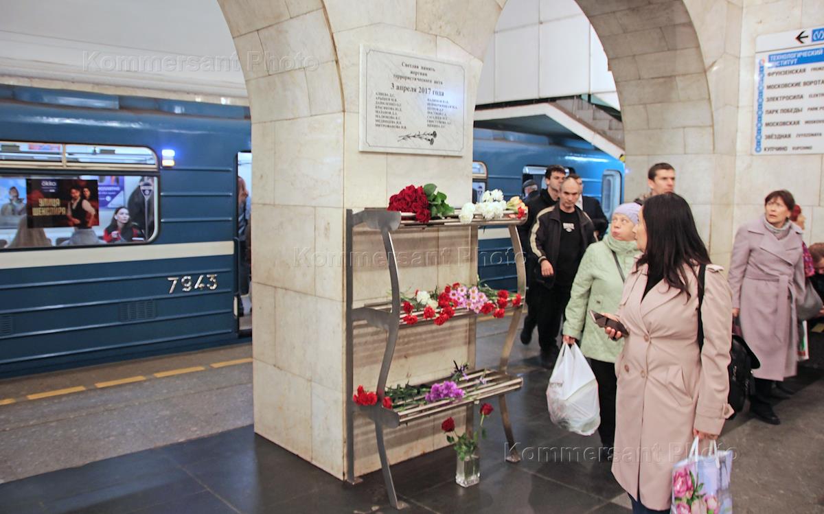 Общество Возложение цветов около мемориальной таблички в память о погибших в результате теракта в метро между станциями "Сенная площадь" - "Технологический институт" в 2017 году в Санкт-Петербурге.
