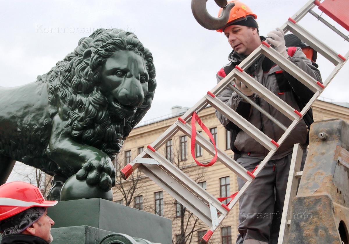 Возвращение декоративных скульптур Львов на Адмиралтейскую набережную после реставрации, вызванной…