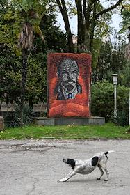Жанровая фотография. Виды Абхазии. Собака на фоне мозаики с изображением вождя революции Владимира…