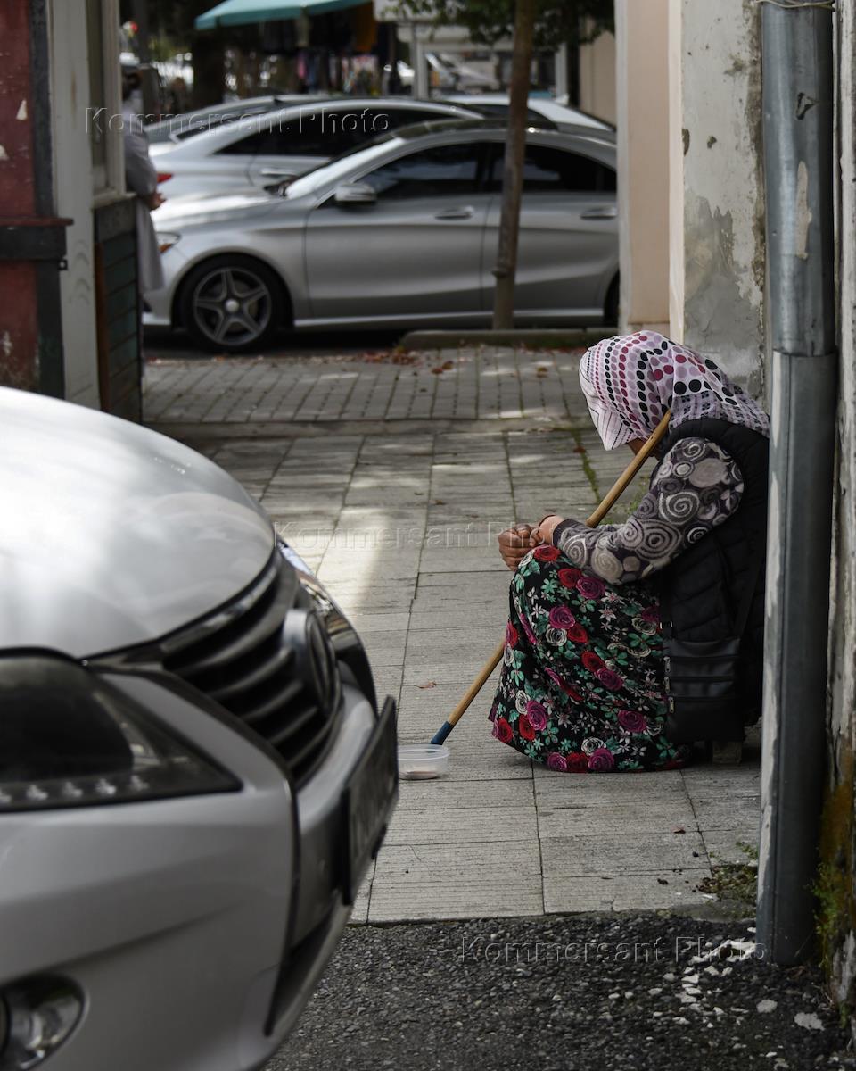 Жанровая фотография. Виды Абхазии. Пожилая женщина просит милостыню на улице.