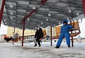 Виды Норильска. Жанровая фотография. Люди катаются на качелях на Театральной площади.