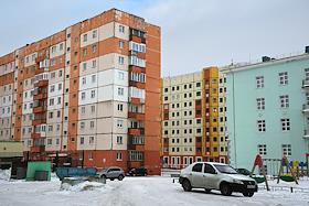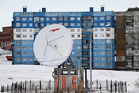 Виды Норильска. Спутниковая антенна на фоне жилого дома.