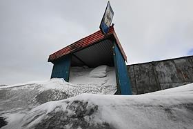 Виды Норильска. Жанровая фотография. Засыпанная снегом остановка общественного транспорта.