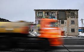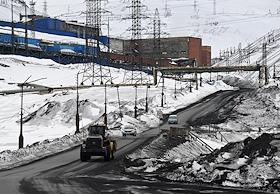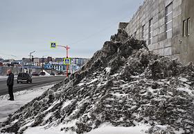 Виды Норильска. Жанровая фотография. Сугроб почерневшего снега на обочине дороги.