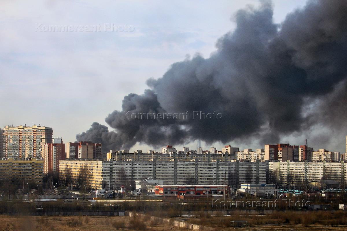 Дым от пожара ангара на улице Маршала Новикова, дом 36 в Приморском районе.
