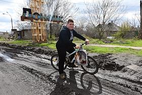 Жанровая фотография. Мальчик едет на велосипеде у въездной стелы "Донецк".