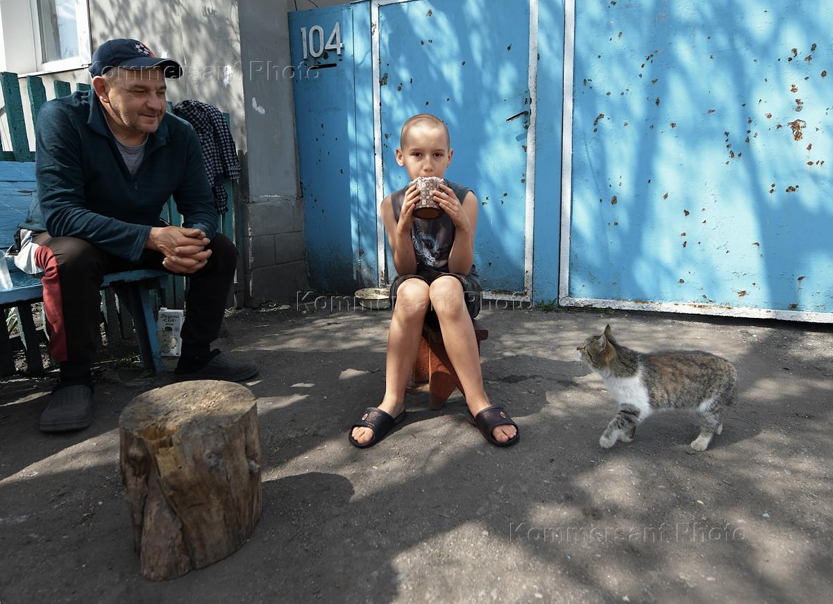 Виды поселка городского типа Тошковка. Жанровая фотография. Мужчина на мотоблоке на фоне…