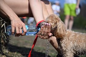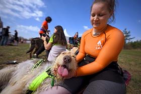 Забег с собаками – кросс "Быстрый пес" в парке "Битцевский лес". Участники после забега.