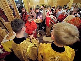 Праздничное Пасхальное богослужение в церкви святых апостолов Петра и Павла в Новой Ижоре. Верующие…