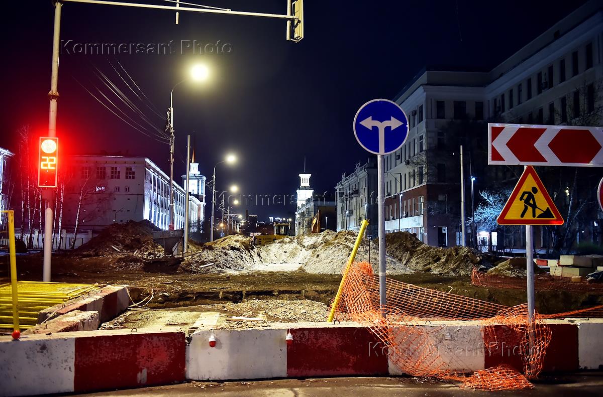 Виды ночного Красноярска. Жанровая фотография. Дорожные работы.