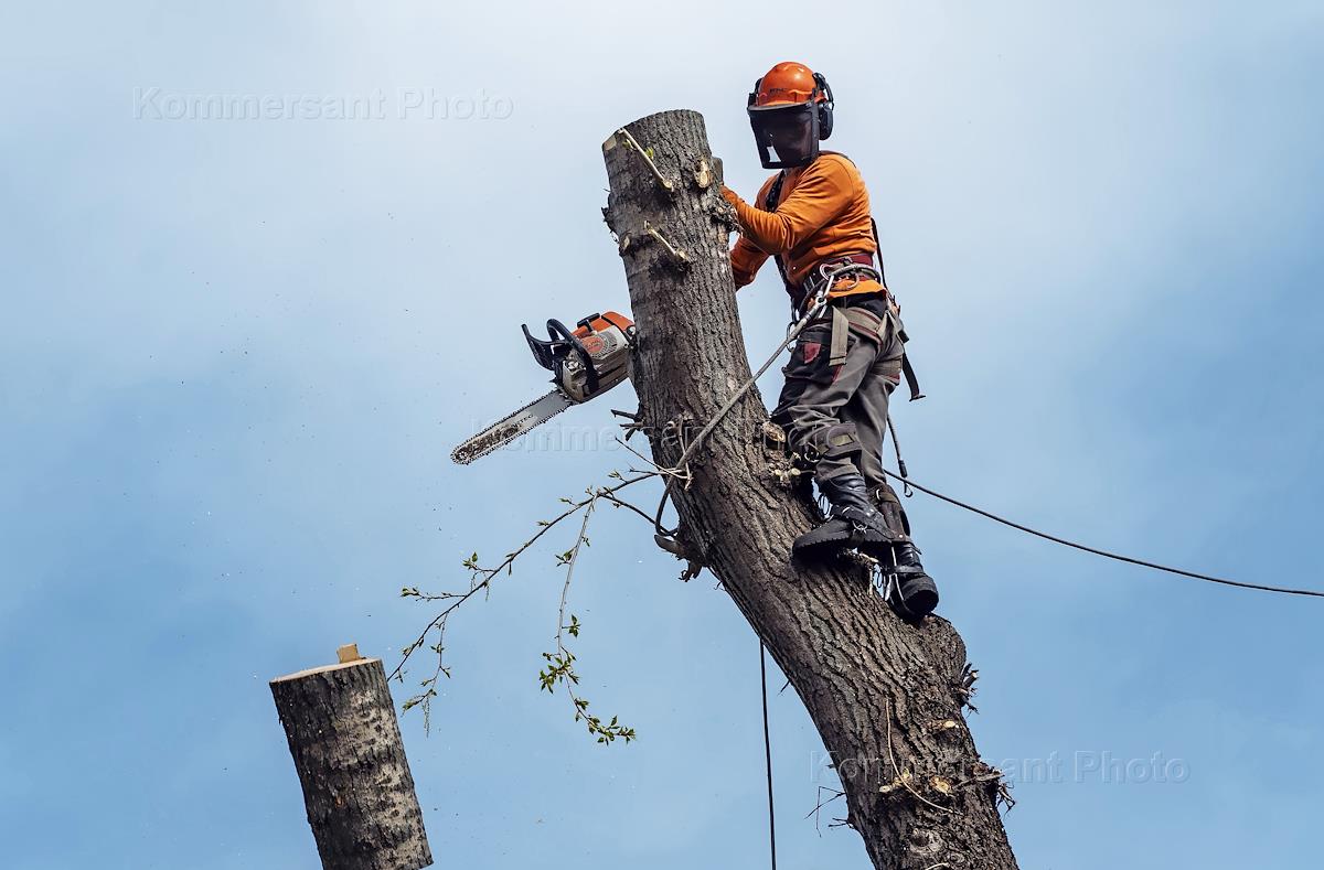 Жанровая фотография. Специалист по обслуживанию деревьев (арбарист) пилит дерево во дворе Дома…