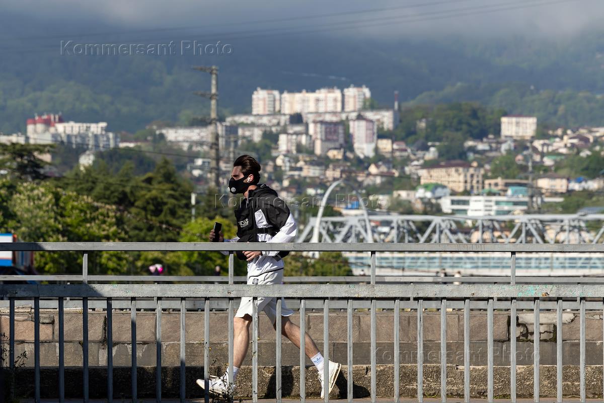 Виды Сочи. Жанровая фотография. Мужчина совершает пробежку по мосту через реку Сочи.