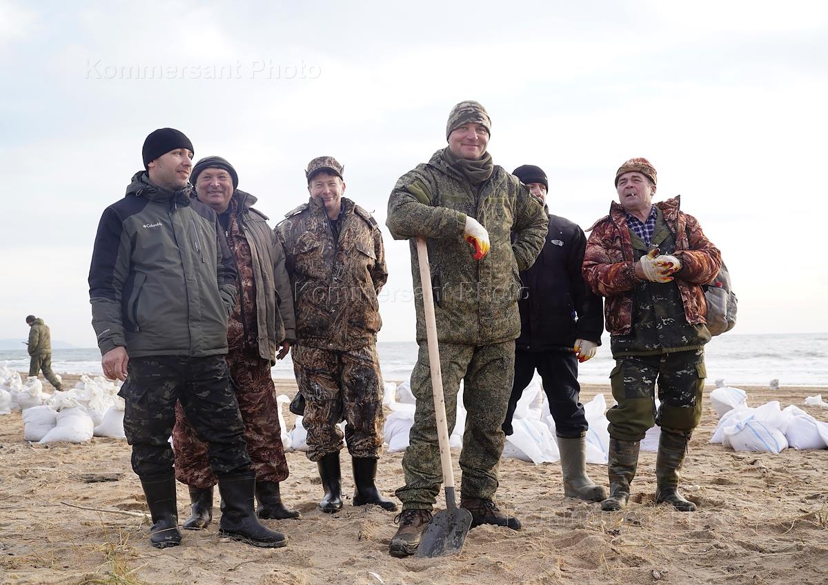 Экология Ликвидация последствий разлива нефтепродуктов из-за потерпевших бедствие двух танкеров "Волгонефть" в Керченском проливе днем 15 декабря 2024 года на береговой линии в Анапе. Уборка мазута волонтерами и работниками МЧС в Анапе.
