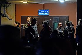 Последствия взрыва в многоэтажном жилом доме по улице Тюленева. Жители на площади у дома.
