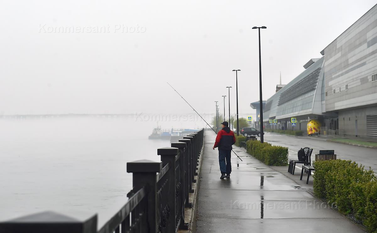 Виды Красноярска во время тумана на реке Енисей. Жанровая фотография. Рыбак на набережной.