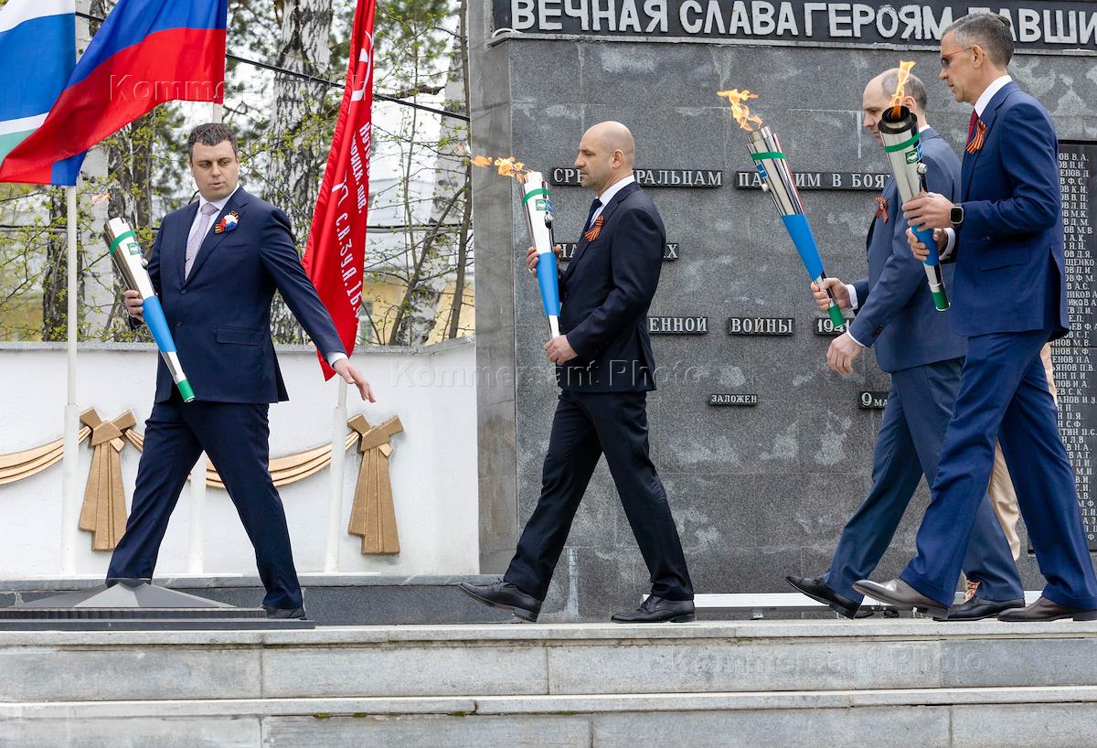 Общество Торжественная церемония зажжения Вечного огня на мемориальном комплексе, посвящённом среднеуральцам, погибшим в годы Великой Отечественной войны в рамках сероссийской акции «Храним огонь Победы», в Среднеуральске.