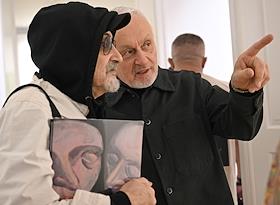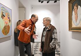 Церемония открытия выставки "Персона" в галерее Alina Pinsky. Художник Борис Орлов (справа) на…