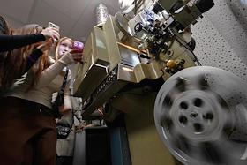 Всероссийская акция "Ночь музеев". Посетители у кинопроектора 23-КПК-2 в выставочном пространстве…