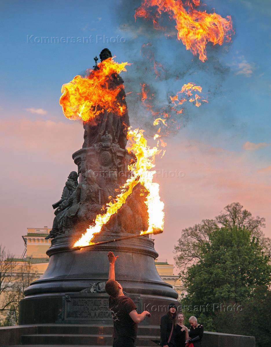 Виды Санкт-Петербурга. Жанровая фотография. Фаер-шоу на фоне памятника на площади Островского,…