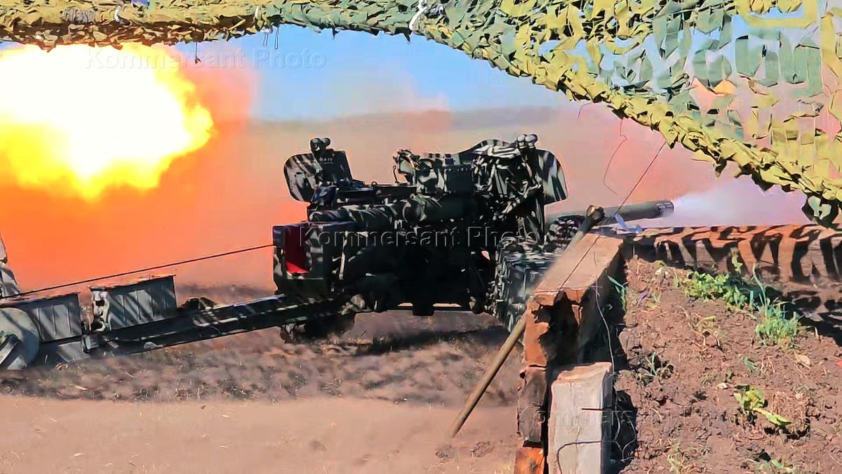 Учения Вооруженных Сил России. Военнослужащие во время артиллерийской стрельбы на военном полигоне.