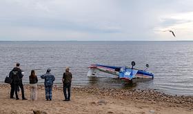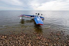 Аварийное приземление легкомоторного самолета на воду на пляже близ аэродрома Бычье поле в Кронштадте.