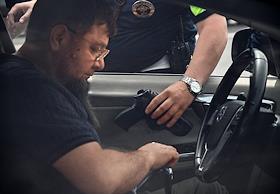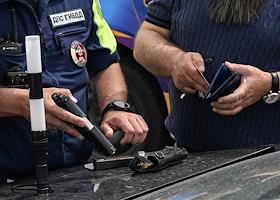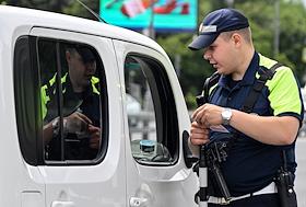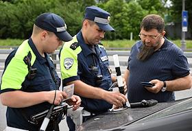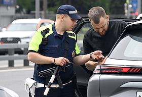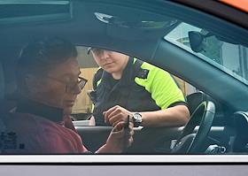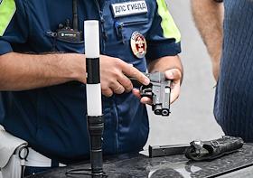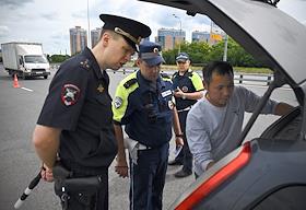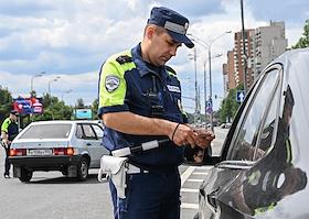 Работа сотрудников ГИБДД на улице: проверка водителей на трезвость за рулем, проверка документов, оформление штрафов.