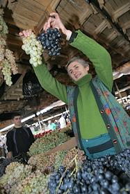 Фляги и бутылки с домашним грузинским вином на прилавке грузинского рынка.