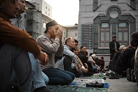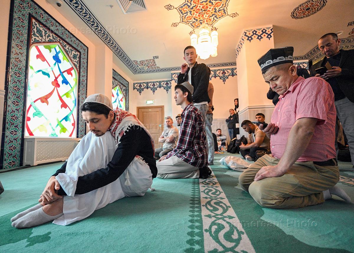 Праздник жертвоприношения Курбан-Байрам в Московской Соборной мечети. Верующие во время праздничного…