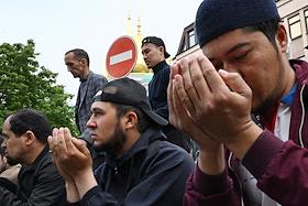 Праздник жертвоприношения Курбан-Байрам в Московской Соборной мечети. Верующие во время праздничного…