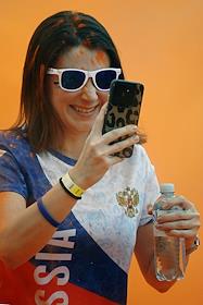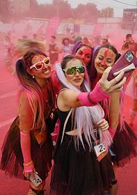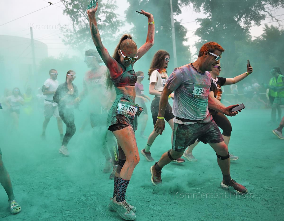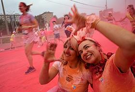 "Красочный забег" на территории Олимпийского комплекса "Лужники". Участники делают селфи после…