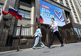 Жанровая фотография. Праздничный плакат, посвященный Дню России, на фасаде здания Государственной…