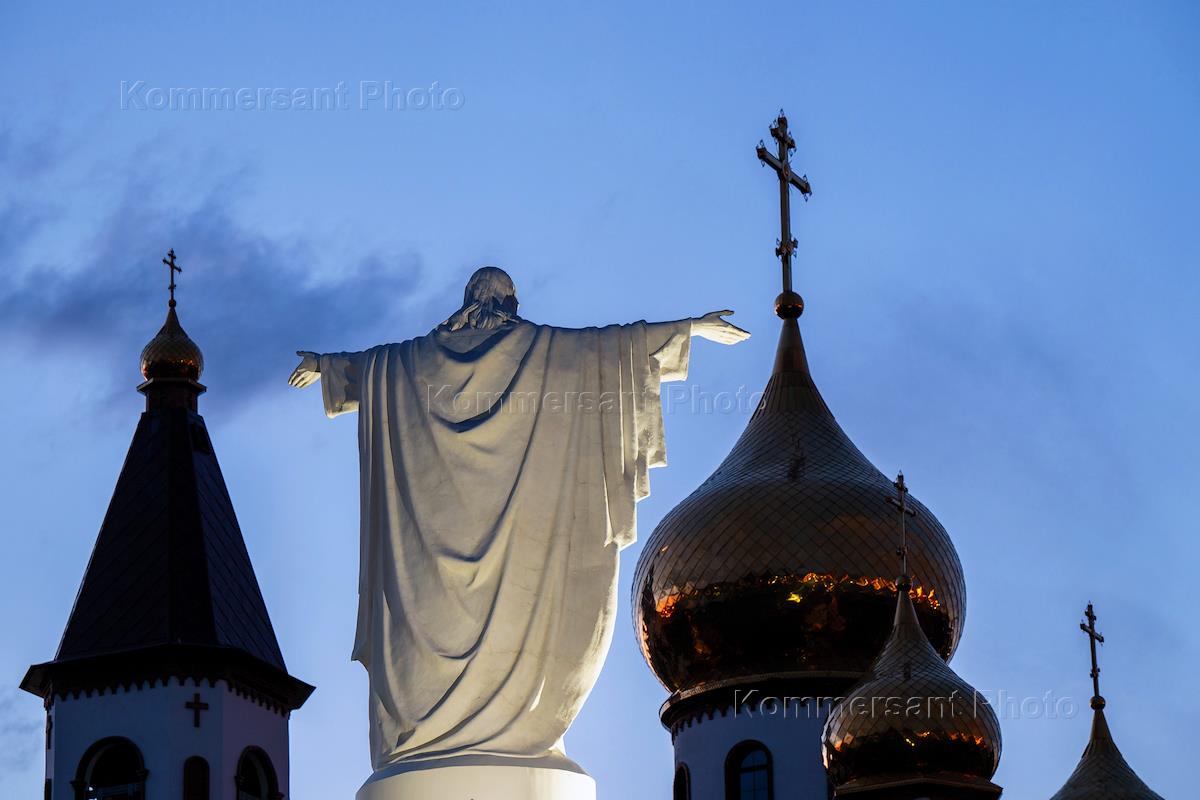 Статуя Христа-Искупителя на фоне храма Новомучеников и Исповедников Российских в Красноярске.