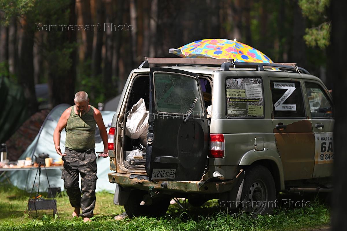 Жанровая фотография. Палаточный лагерь на реке Тара в деревне Окунево. Автомобиль едет по грязной…