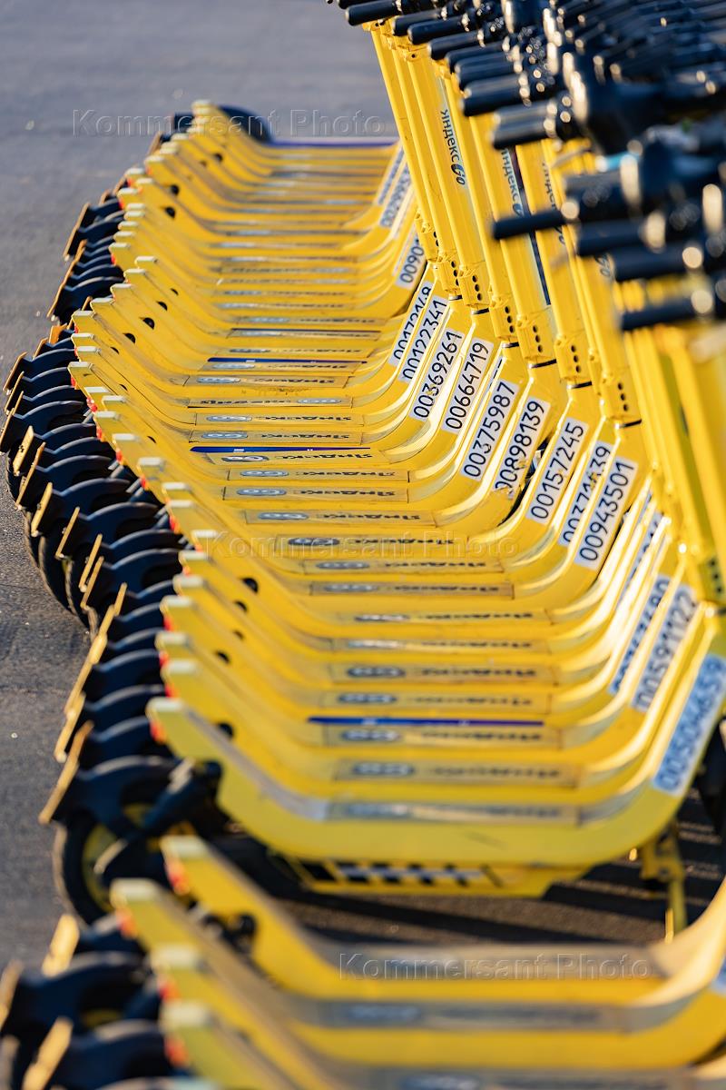 Виды Санкт-Петербурга. Жанровая фотография. Электросамокаты компании "Яндекс" на городской парковке.