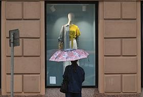 Жанровая фотография. Девушка стоит под зонтом во время сильного дождя у витрины магазина одежды…
