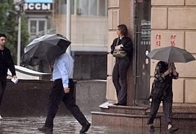 Жанровая фотография. Люди идут по улице во время сильного дождя.