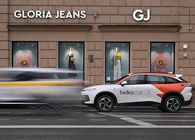 Жанровая фотография. Автомобиль каршеринга Belka Car едет по улице во время сильного дождя. Витрина…