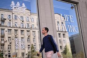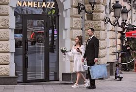 Жанровая фотография. Молодые люди у входа в магазин одежды российского бренда Namelazz на улице…